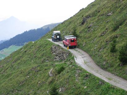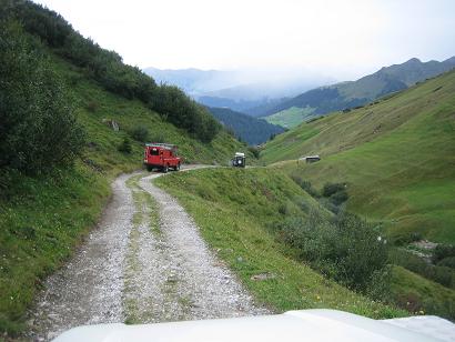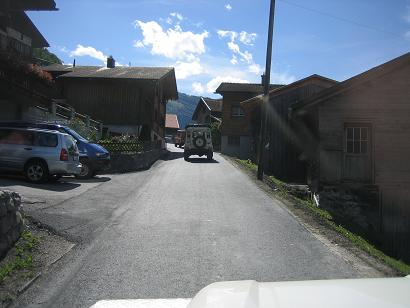 Wir trafen uns am Samstag 2. September gegen Mittag auf der Autobahnraststätte “Heidiland“. Auf der Raststätte war ein gigantischer Betrieb, jeder Parkplatz besetzt, die Menschen sausten umher wie in einem Armeisenhaufen und man hatte fast den Verdacht, dass es hier was umsonst gibt. Ich glaube auch, dass alle froh waren als wir diesen Platz verliessen und uns auf einer Gartenterrasse eines Kleinen Restaurants wieder trafen. Auf der Fahrt dorthin wurde bei einem Serie II Landy die Benzinpumpe etwas zu und es bildeten sich Luftblasen, so dass ein weiterkommen ohne Abkühlung nicht mehr so ohne weiteres möglich war. Er wurde kurzerhand an den Haken genommen um etwas abzukühlen.